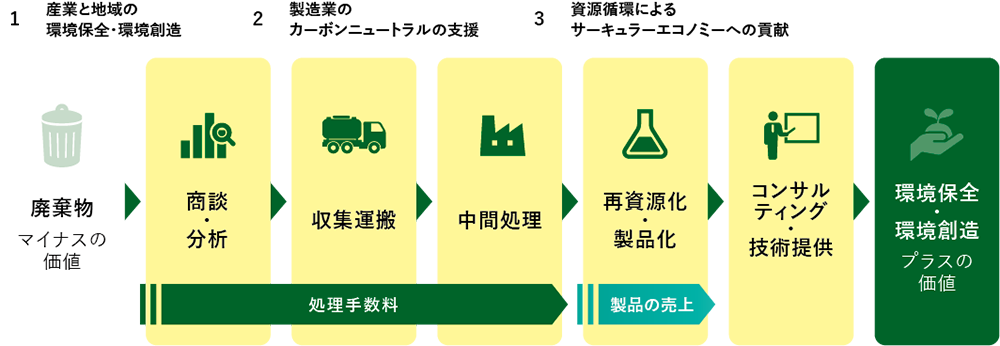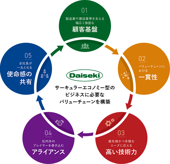 私たちは社会から求められる環境価値を提供するために、廃棄物処理とリサイクルの分野において、「オールダイセキ」で事業活動を展開しています。これにより顧客の幅広いニーズに一貫した対応を行いながら、環境創造のあらゆるステップで収益を生み出しています。
