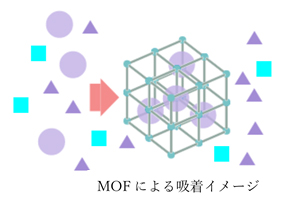 MOF(Metal-Organic Frameworks)は多孔性配位高分子(PCP)とも呼ばれ、金属イオンと有機配位子がジャングルジム状に組み上がった多孔性材料です。2025年10月に開発者である京都大学特別教授の北川進氏をはじめとする3名がノーベル化学賞を受賞したことでより一層注目を集めています。MOFは構成する金属、有機配位子の組み合わせによって空間内の広さや性質を自由に設計することができ、混合ガス中から特定の成分を選択的に吸着することが可能です。