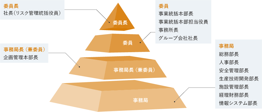ダイセキグループではリスク管理統括役員である社長を委員長とするリスク管理委員会を設置し、リスク管理に関わる情報収集や啓発、対策の策定や運用などを行っています。また、その活動の実施にあたり、業務の遂行を阻害する行為があると認める場合には速やかに当該行為の是正のための措置を講じています。