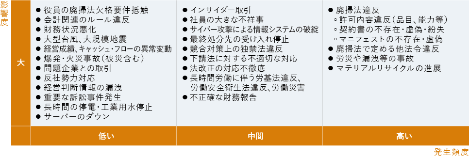 廃掃法をはじめとする法令違反、労災・漏洩等の事故が最も大きいリスクになると判断しているため、安全管理とコンプライアンス遵守を強化しています。また、マテリアルリサイクルの進展に対応するため、新規事業開発と研究開発を進めています。